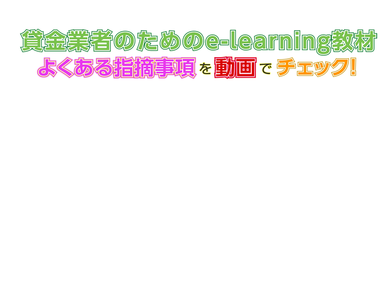 このe-learning教材は、貸金業者の皆さまに貸金業務の適切な運営を確保していただくためのツールとして、東京都と日本貸金業協会が共同で制作したものです。 東京都が行う検査や日本貸金業協会が行う監査における指摘事項や指導事項などを踏まえ、貸金業者の皆さまに特に留意していただきたい5つの事項について、そのポイントを動画で分かりやすく解説しています。