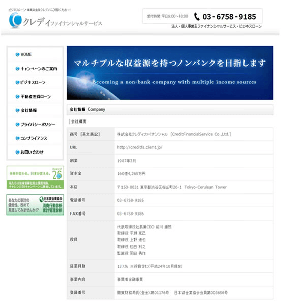 | ≪掲載日:平成25年7月1日≫ 登録貸金業者、日本貸金業協会の協会員を装い、HP等により融資の勧誘を行っている。 | ||||