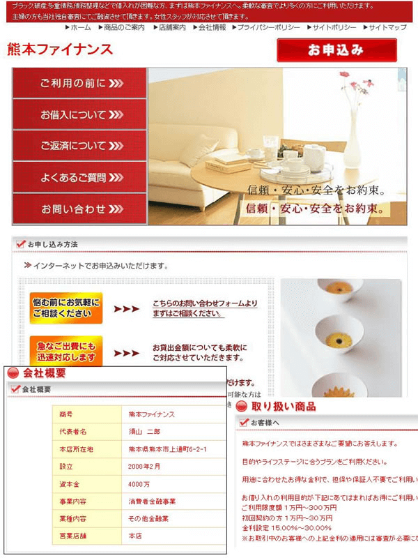 | 登録貸金業者を装い、携帯サイトにて融資の勧誘を行っている。 | ||||